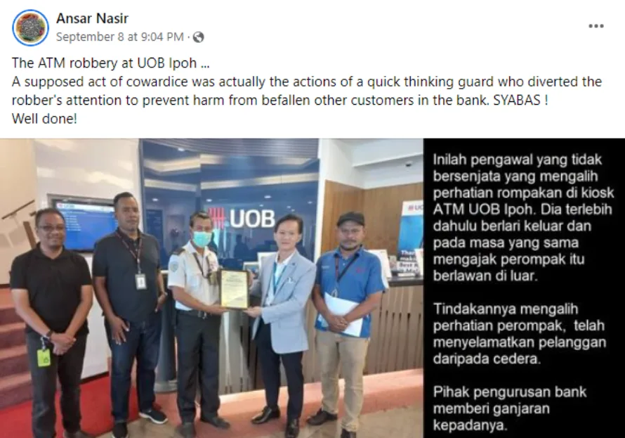 Upon a closer look at the video, the security guard diverted the robber’s attention by taunting him to a fight and getting him to exit the premises. By doing so, the two victims were left unharmed from the incident. A Facebook post by Ansar Nasir revealed that the bank management had even rewarded the security guard for his quick thinking.