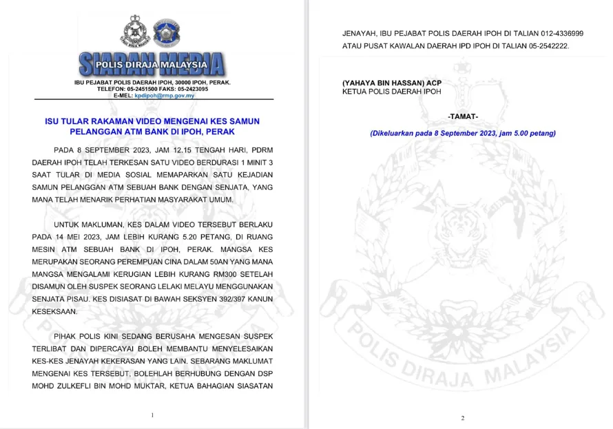 The video also prompted a statement from local authorities, who provided more clarification on the incident. According to the press release, the robbery happened on 14th May 2023 at the Ipoh branch of a UOB Bank. However, the case is still under investigation and the robber is still on the run.
