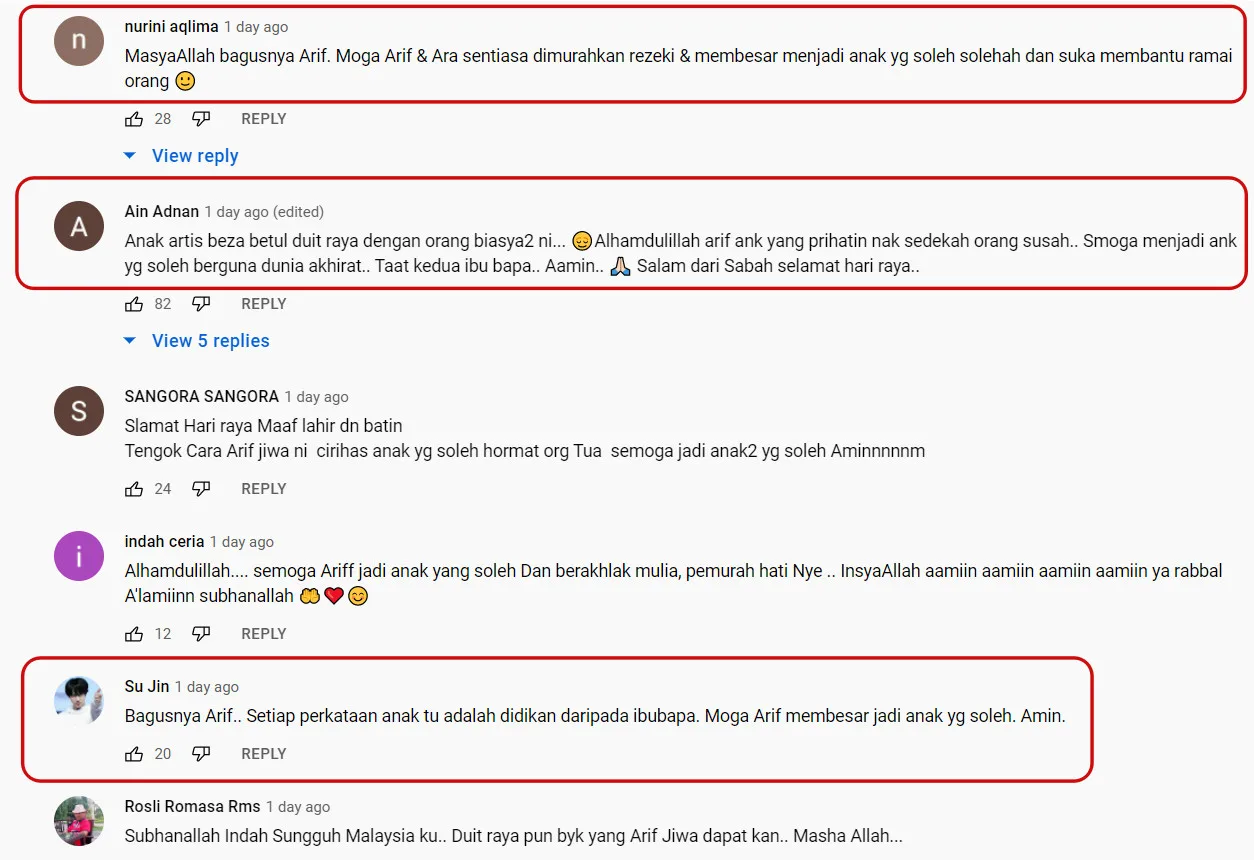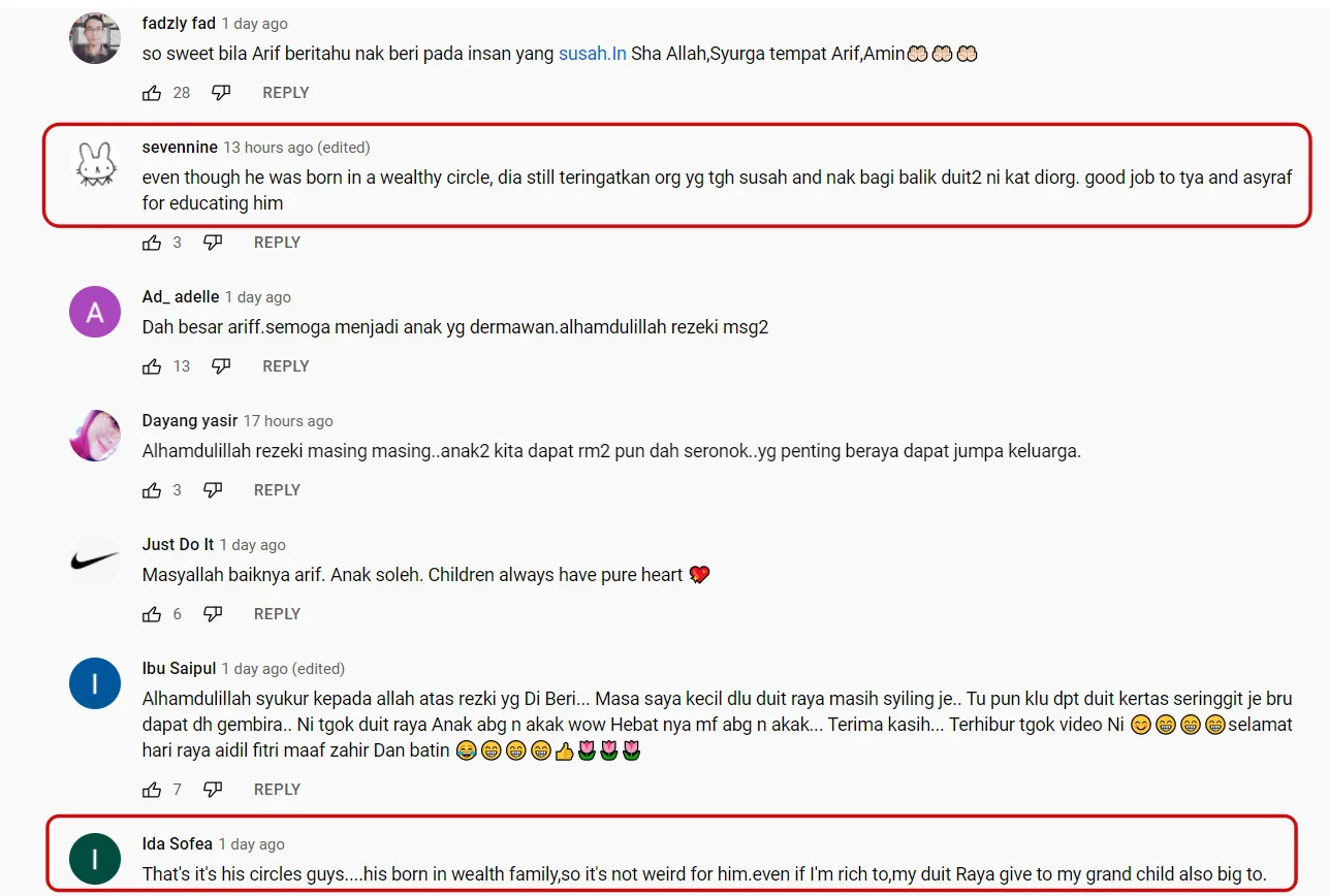 Scrolling through the comments, many were highly impressed by Arif’s kind-hearted manner. To quote one commentator, “Even though he was born in a wealthy circle, he still remembers those who are suffering (financially), and want to give back to the people. Good job to Tya and Asyraf for educating him.”