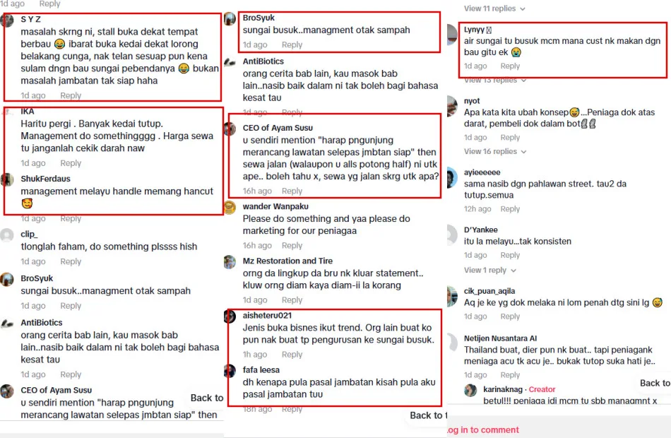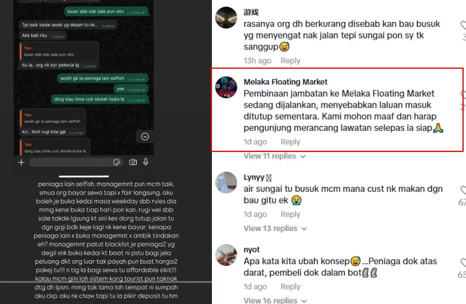“[Management] should’ve blacklisted all these selfish vendors and give that opportunity to those willing to open their businesses here. Also, they should make the rent more affordable. I’d leave if I could, but I’ve already paid the deposit,” the vendor wrote. After the TikTok post went viral, with over 315k views, the Melaka Floating Market TikTok account, believed to be the aforementioned management, came forward in the comments section with an explanation as to why there have been no customers lately.