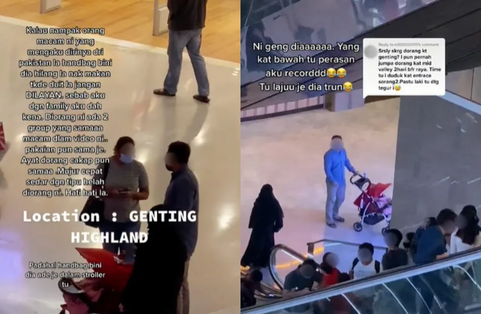 In the first video, the TikTok user showed a couple who claimed to be from Pakistan. In her caption, she said that the couple will try to scam people by sharing a story of how the wife lost her handbag and that they don’t have any money to feed their child. @hudanadiah_ or Huda pointed out that the woman did in fact had a handbag hidden underneath the baby stroller.