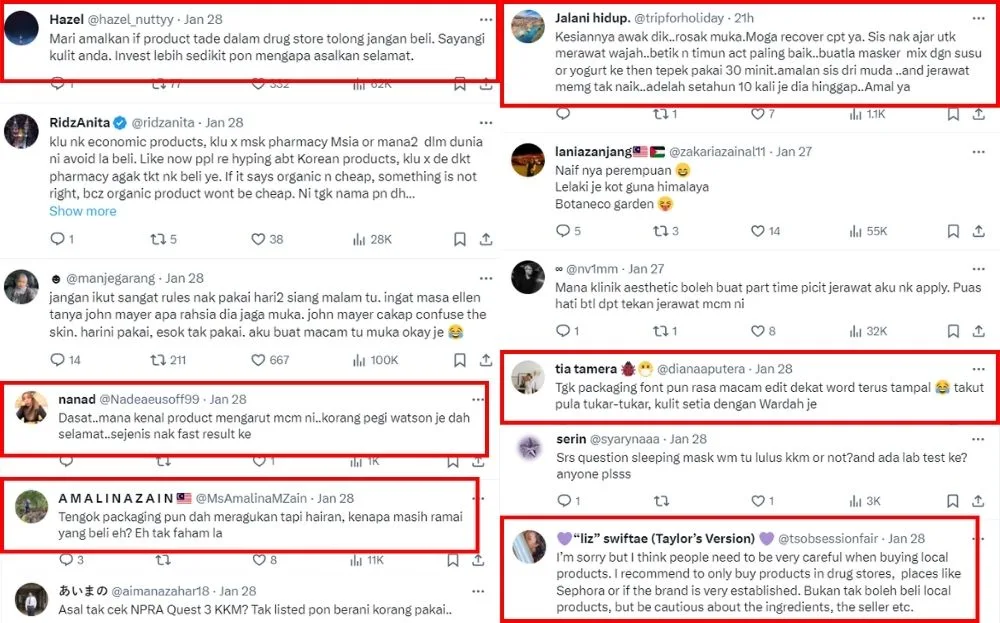 Twitter users have also reacted to the issue, with many voicing concerns for the affected users. Some netizens also urged others to be wary of local cosmetic brands, especially if they are not available at reputable stores, as they may contain harmful ingredients like mercury. However, others defended locally-owned brands, saying many have proven efficacy and are backed by proper research. There are also comments saying that Rajeswary was to blame for her skin condition because she bought from an unknown brand without doing proper research beforehand.