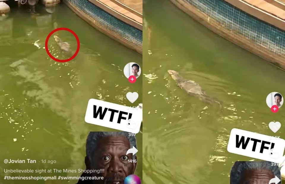 A short video of what appears to be a monitor lizard emerging from a lake is currently going viral online. The incident took place in The Mines, a famous shopping centre in Seri Kembangan, Selangor.