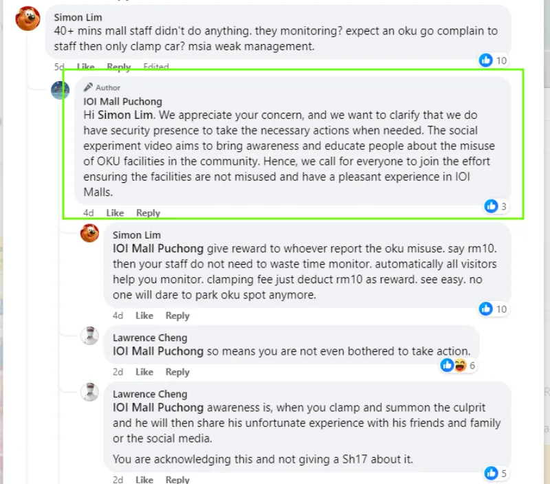 Some netizens criticised IOI Mall Puchong for allowing such things to happen while on their watch. The company replied, “We do have security presence to take the necessary actions when needed. The video aims to bring awareness and educate people about the misuse of OKU facilities in the community. Hence, we call for everyone to join the effort to ensure the facilities are not misused and have a pleasant experience in IOI Malls”.