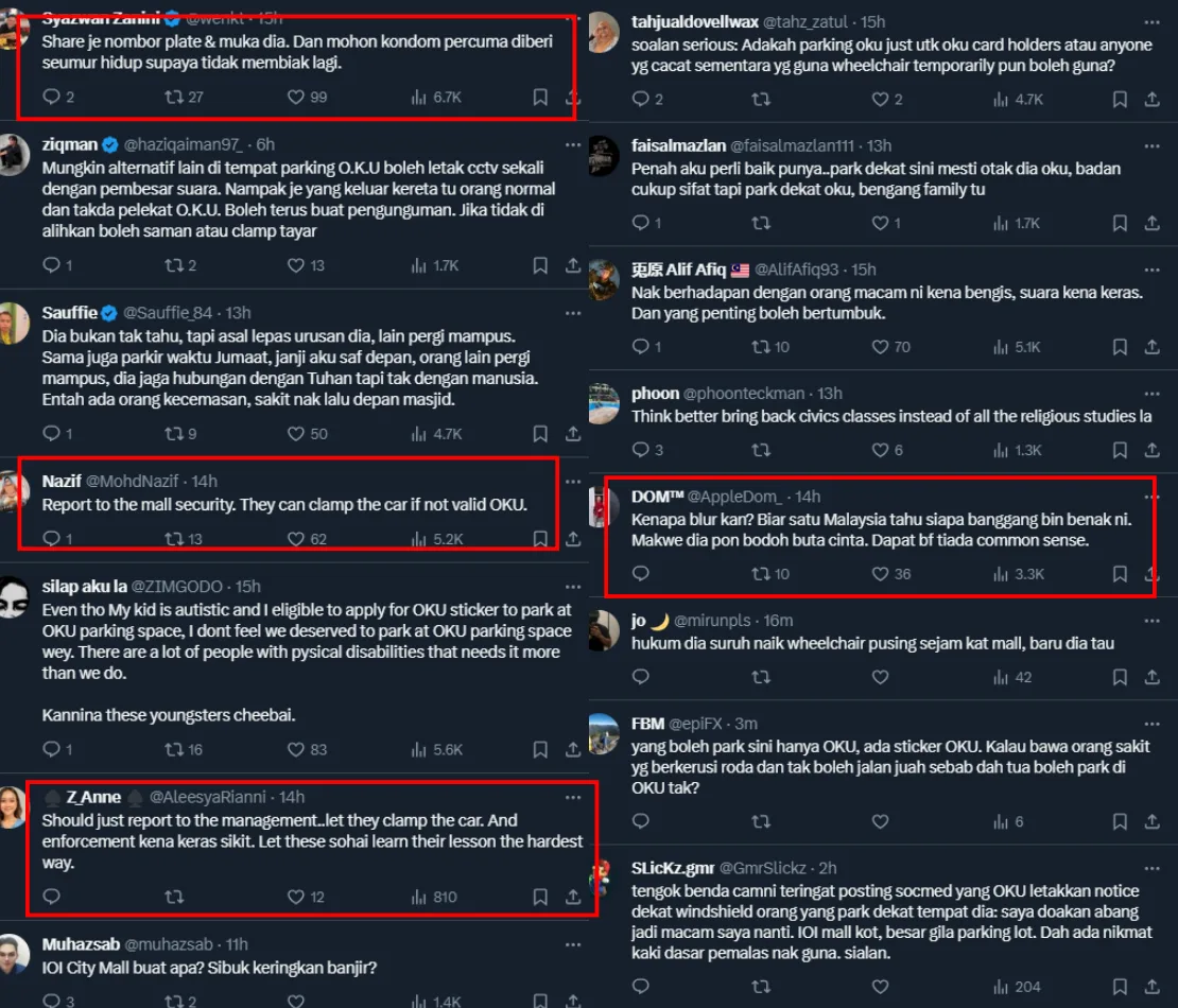 The video has since gone viral and was reposted on Twitter by user @anthraxxx781 where netizens slammed the shoppers for abusing the OKU parking spaces. Many urged that Zachary and IOI expose the shoppers’ faces and plate numbers to shame them while others suggested that security should clamp the cars if they fail to provide any certifications of their disabilities.