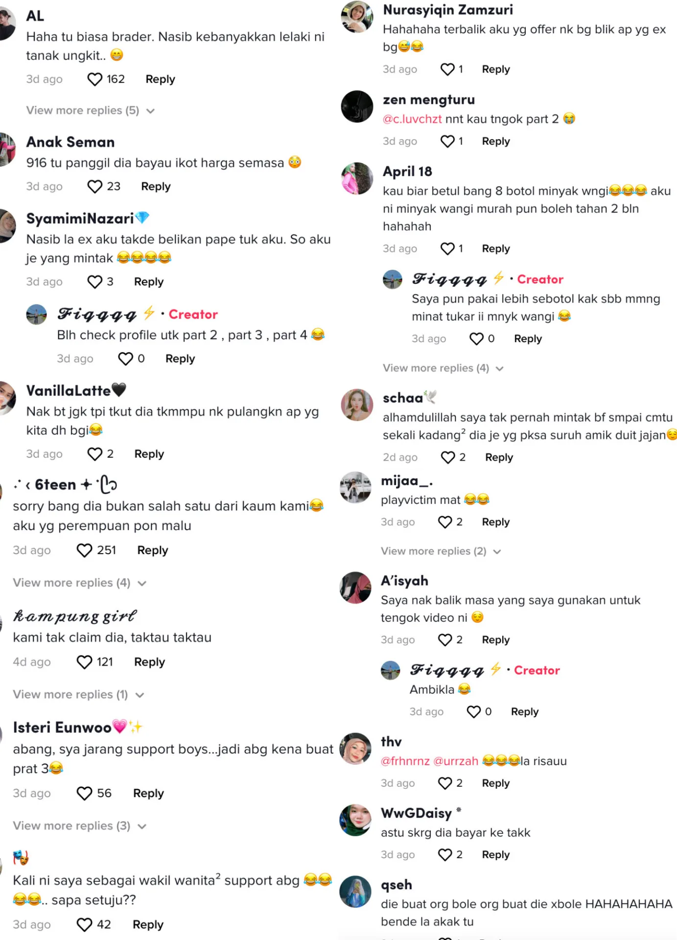 While the woman’s demands drew attention, the TikTok account owner’s witty response elicited criticism towards the woman and sympathy for the man, accusing the woman of playing the victim. He requested a Charles & Keith handbag (RM219), a gold necklace (RM796), eight bottles of Victoria’s Secret perfume (RM45.59 each), a Swatch watch (RM300) to be returned, and mockingly, the time he had spent for the woman until he had to purchase five medical certificates.