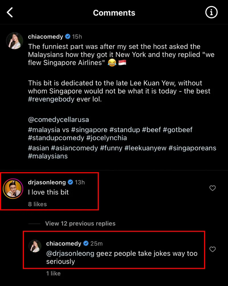 However, it seems that not everyone was offended by the bit. Many comments on Jocelyn’s Instagram post were on the positive end, including one from local comedian Jason Leong, who commented, “I love this bit.“