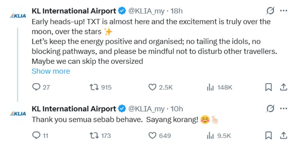 The interaction between TXT and local MOAs also prompted praise. Many K-pop fans and netizens praised Malaysian MOAs for maintaining a safe distance from the members and not causing a disturbance at the airport. Even KLIA’s official social media thanked the crowd for prioritising safety and following the rules.