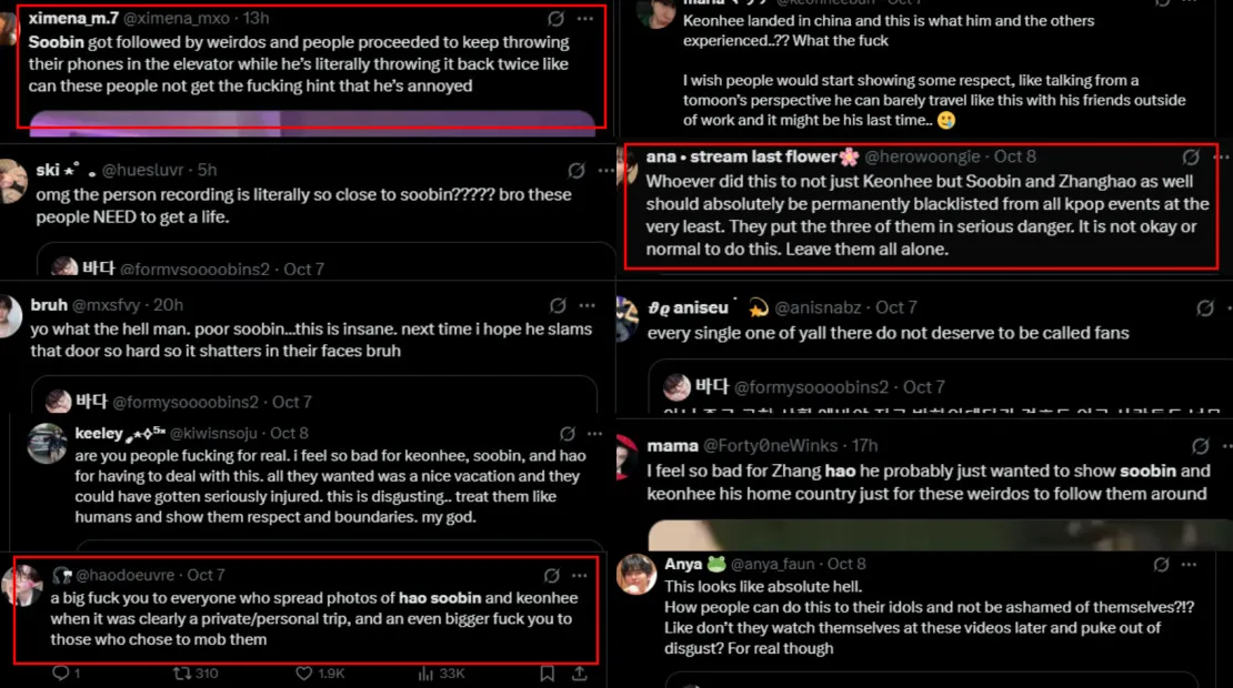 Earlier this week, videos began circulating online showing several K-pop idols being mobbed by sasaengs at the airport shortly after arriving in China. The idols in question were ZEROBASEONE’s Zhang Hao, TOMORROW X TOGETHER’s Soobin, and ONEUS’s Keonhee, who were reportedly on a holiday together without their management. According to fans, the idols were first spotted at Incheon International Airport, and photos of them began circulating, alerting the sasaengs that they would be arriving.
