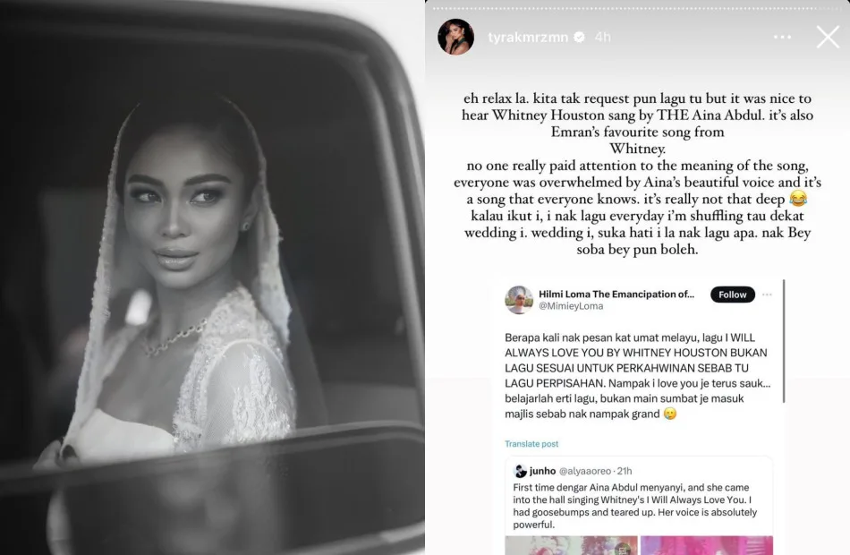 Responding to what netizens have been saying on Twitter, Tyra said that her guests didn’t really care much about the lyrics as they were all entranced by Aina’s singing. “Relax, I didn’t actually request the song but it was nice to hear THE Aina Abdul singing Whitney Houston. Plus, it’s also Emran’s favourite Whitney song. It’s not that deep. It’s our wedding so we get to choose whatever songs we want,” the influencer wrote.