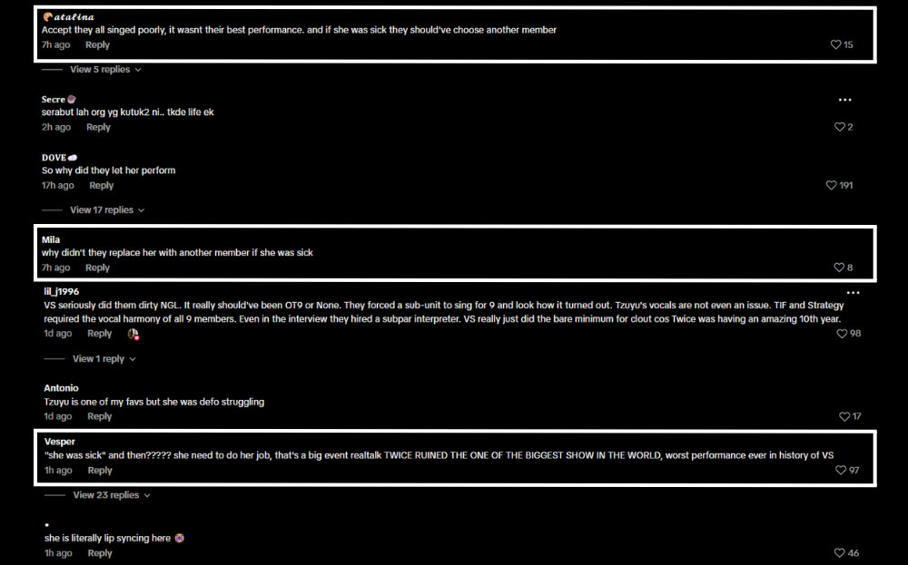 It later emerged that there was a reason behind the shaky vocals. In a heartfelt message shared on the fan communication platform Bubble, Tzuyu revealed that she had been battling illness in the days leading up to the show. “Before coming to New York, I warmed up my throat with a vocal teacher. But after arriving in New York, my throat got worse and worse. My voice was still good during rehearsal, but it got worse during the actual performance, and I couldn’t make a sound because I had phlegm in my throat,” she wrote.