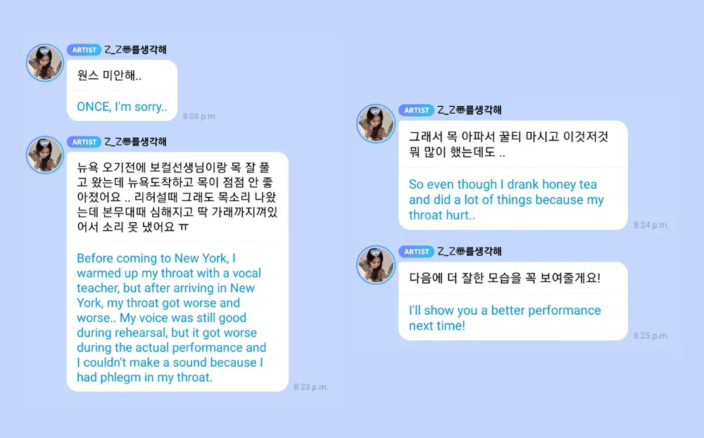 The 26-year-old idol went on to apologise to fans, expressing her disappointment over not being able to deliver her best performance. “I’ll show you a better performance next time!” she promised, adding that she had tried drinking honey tea and using various remedies to soothe her throat, but her condition did not improve in time.