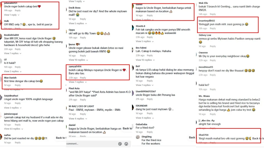 Netizens reacted to the video, with some praising the business owner for doing his research on the malls before setting prices for the dishes on the menu. Others expressed disappointment, saying that RM16 at MyTOWN is barely any different if they were to dine at Pavilion KL. Many also found it humorous how he roasted Mr. DIY. There were also TikTok users who were distracted by Uncle Roger speaking Malay, as this was the first time they had heard him speak the language.