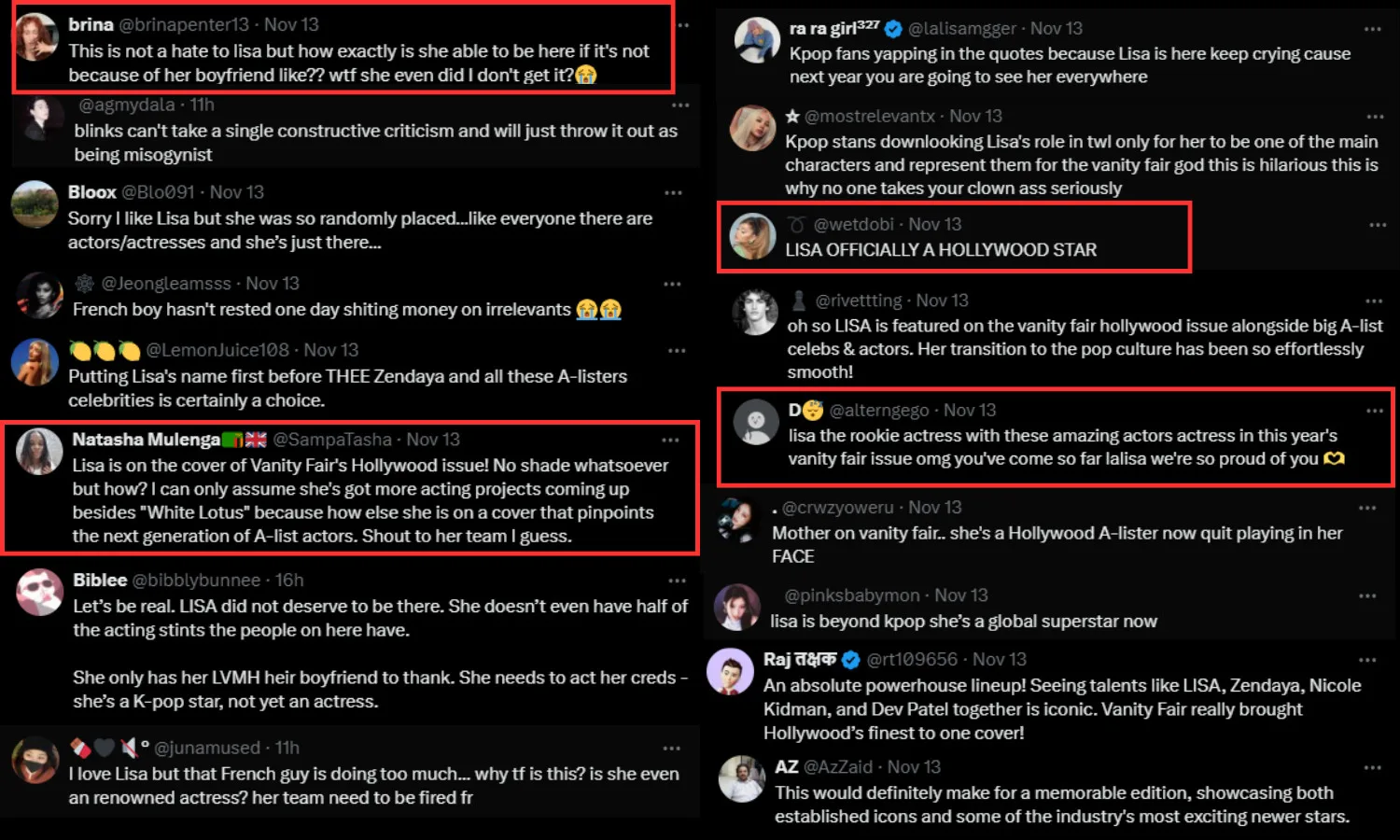 After the full list of cover stars was unveiled, a variety of reactions surfaced online. Many netizens questioned Lisa’s qualifications and eligibility to stand on par with other renowned American stars in the film industry, with some speculating that her rumoured boyfriend, Frederic Arnault, played a role in her rise in the Hollywood scene. While some fans acknowledged the 27-year-old singer’s upcoming acting debut, they still felt uncertain about how she fit into this category.