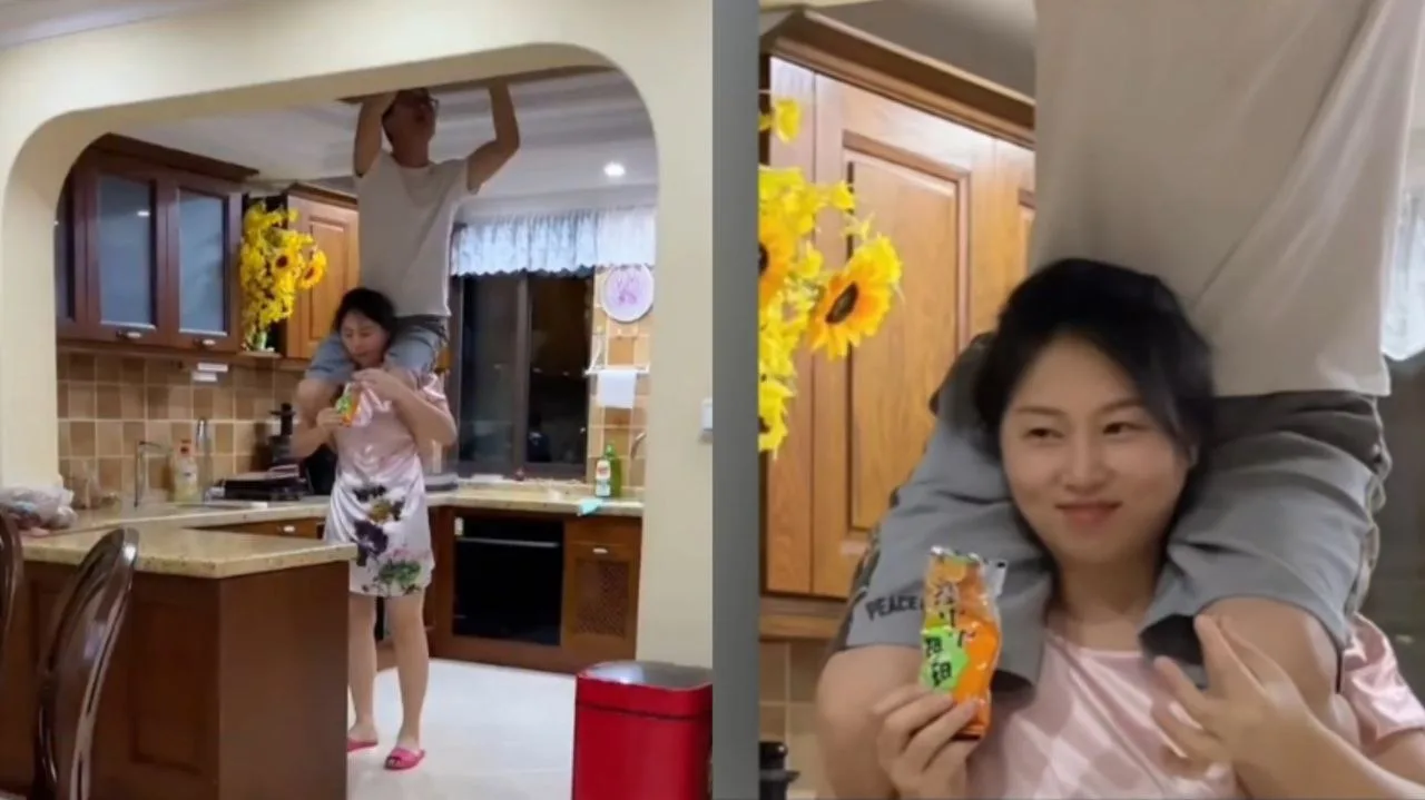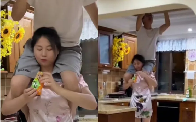 From the video, a man is seen sitting on his wife’s shoulders while he changes the lightbulb. The woman did not even show any signs of struggle while she was carrying the weight of her husband on her shoulders. Throughout the whole time, she was even snacking and managed to smile for the camera!