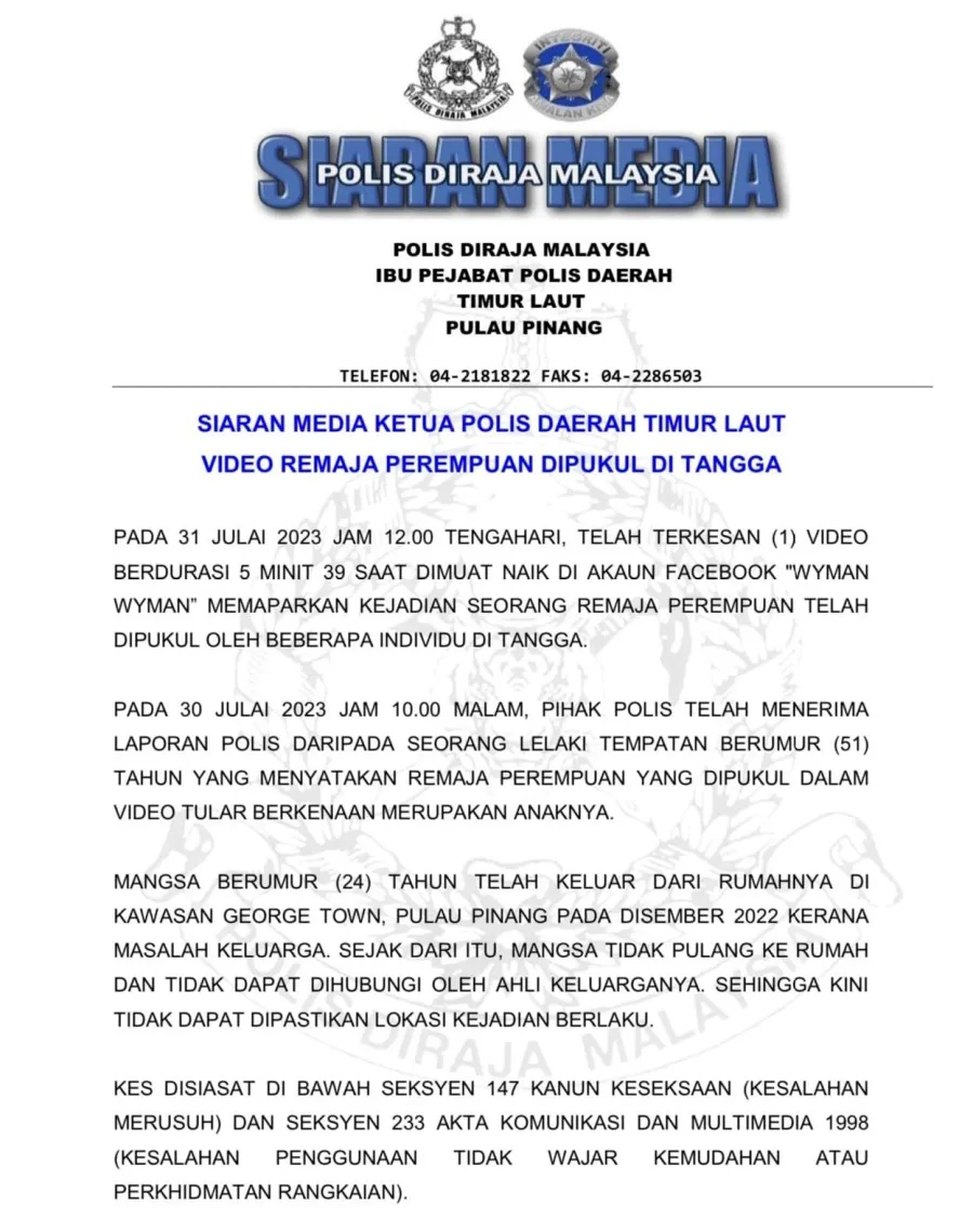 Timur Laut District Police Chief Assistant Commissioner Soffian Santong told reporters that the father has filed a report and that the case is currently being investigated under Section 147 of the Penal Code for rioting and Section 233 of the Communications and Multimedia Act 1998.