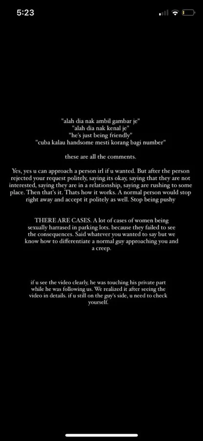 As seen in the screenshot above, the victim posted a follow-up tweet to respond to those who blamed her for the incident. In her post, she wrote, “(There are) a lot of cases of women being sexually harassed in parking lots. (Say) whatever you (want) to say but we know how to differentiate a normal guy approaching and a creep. If you (watch) the video (again), you can see that he was clearly touching his private parts while he was following us. If you’re still on his side, you need to check (yourselves)”.