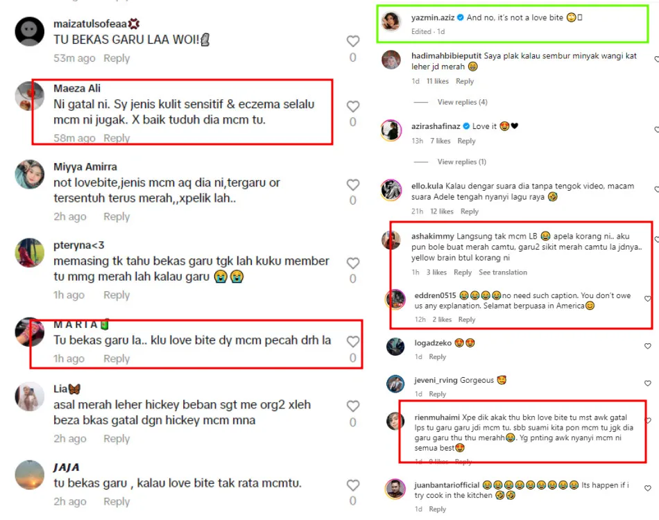 It’s unfortunate that Yazmin Aziz had to butt in and clarify what the marks were but maybe it’s better than just letting the negative comments be until they fester into slander. Watch the video below and let us know if the marks looked like love bites or simply scratch marks: