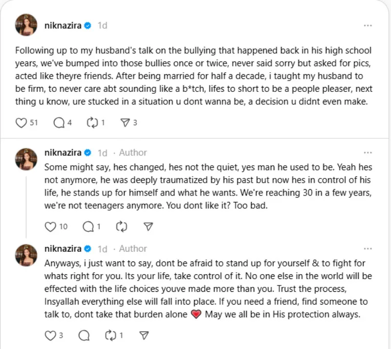 His wife, Nik Nazira, took to Threads to provide more details about the encounter, explaining how the bullies treated him after he gained success. “We’ve bumped into those bullies once or twice. They never apologised but asked for photos together, acting like they’ve always been good friends. After being married for half a decade, I taught my husband to be firm, to never care abt sounding like a b*tch. Life’s too short to be a people pleaser,” she wrote.