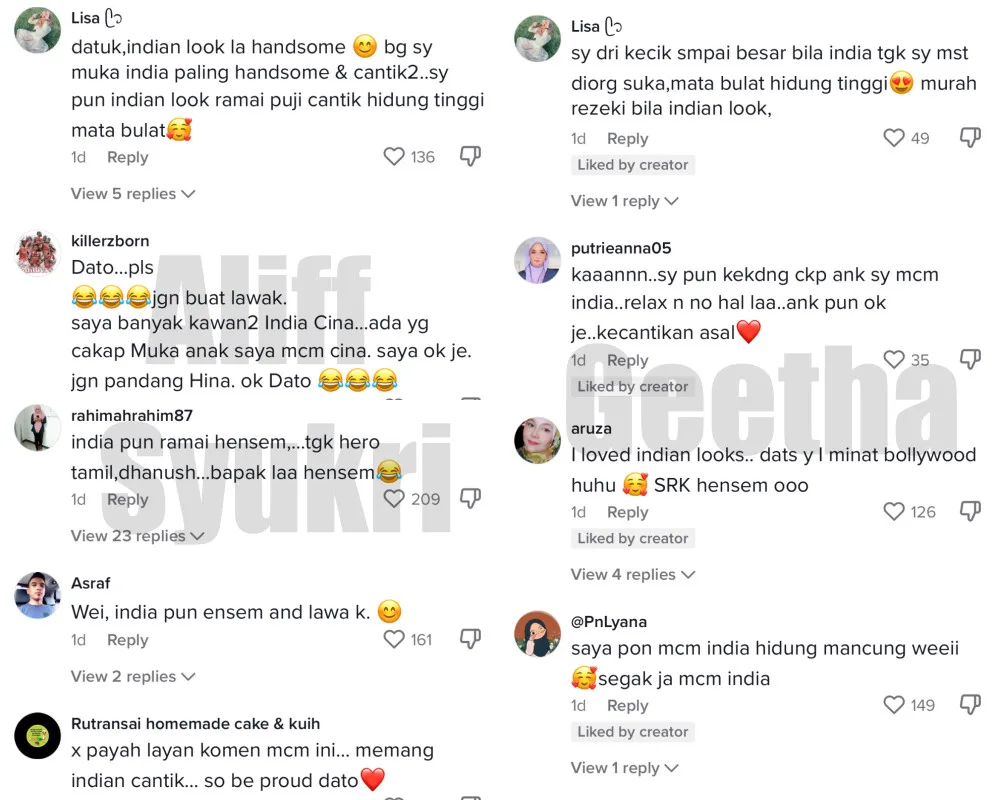Scrolling through the TikTok comments on both videos, many are talking about how people of the Indian race are all beautiful. On the “Badang” star’s comment section, one netizen said, “Don’t mind these kinds of comments. Indians are beautiful. So be proud Dato.” Another comment from Geetha Ji’s video said, “I sometimes myself say my child looks Indian. Not a problem at all. My child is also okay. Natural beauty.”