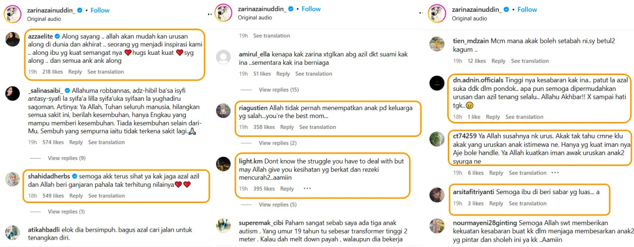 Many netizens took to the comments section to send some heartwarming words of encouragement and prayers for Zarina. “We don’t know the struggle you have to deal with, but may Allah bless you with good health and grant you abundant sustenance,” one follower of her commented. “I wish for you to maintain good health in taking care of both Azal and Azil. And I pray God shall bless you with abundant rewards,” Aliff Syukri’s wife, Shahidah, commented.