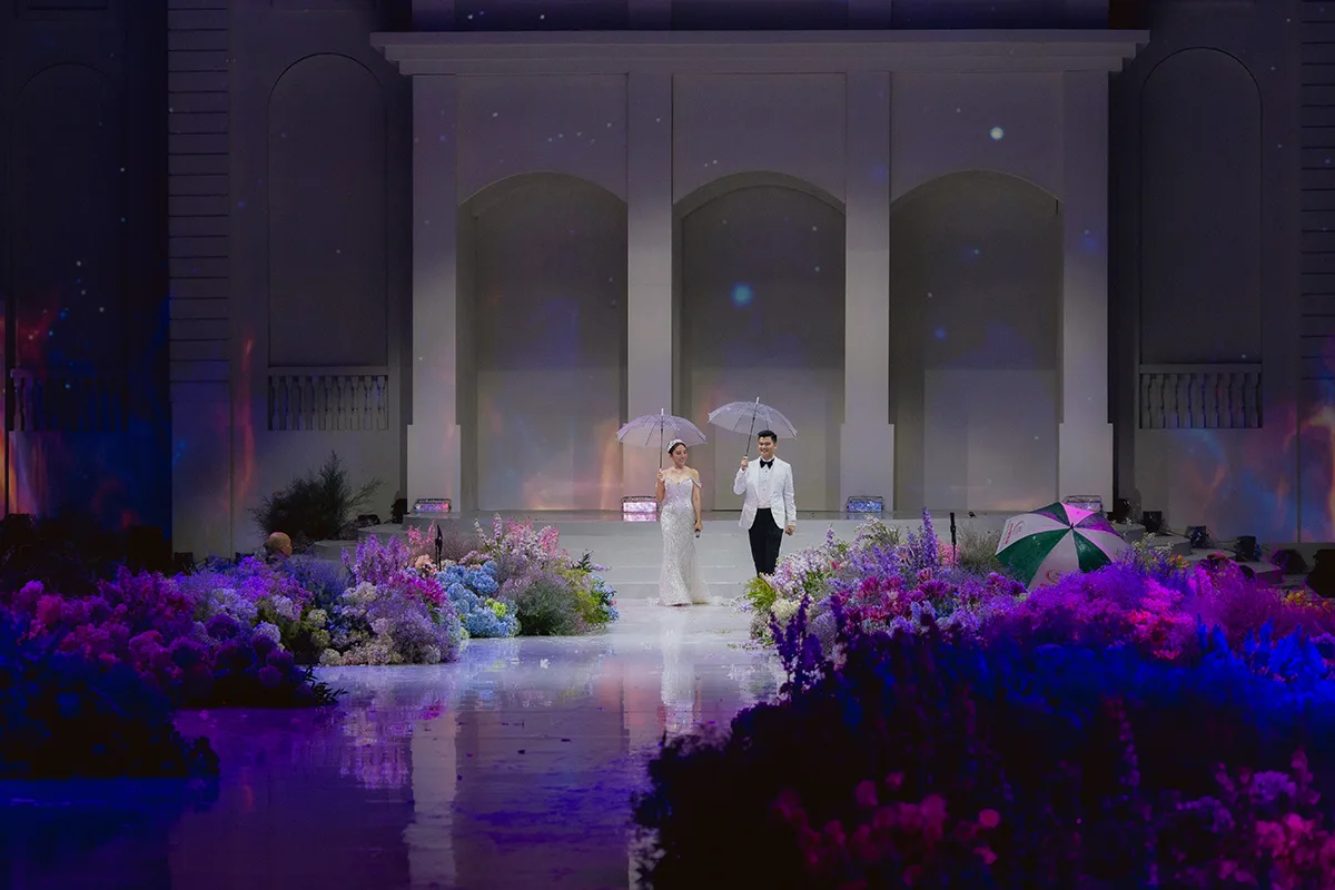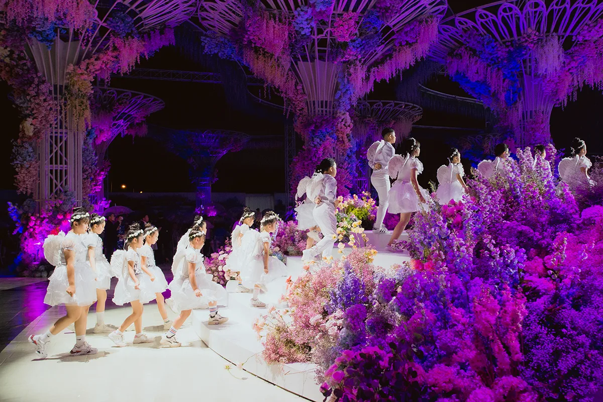 The wedding planner used one of the largest projection systems available in Vietnam, spanning over 700 square meters. The idea was to share the love of the couple through lighting effects, music, and 3D visuals. Additionally, there was even a colourful fireworks display among the sea of flowers.