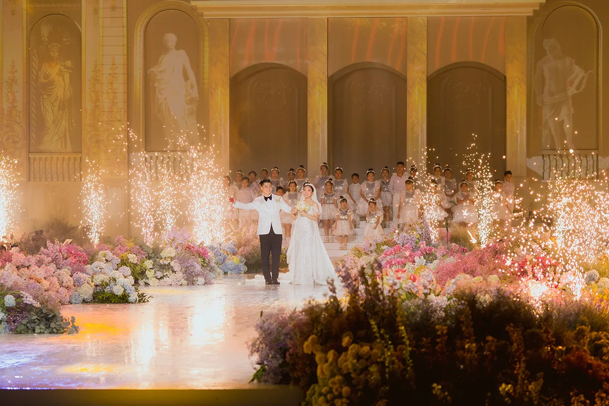 The banquet hall was decorated with 25 tons of premium silk wedding flowers and five tons of fresh flowers which turned out to be a beautiful sight! A number of different shows were performed including one by Duc Phuc and many other famous Vietnamese artists. The event was so extravagant it seemed more like an awards show than a wedding.