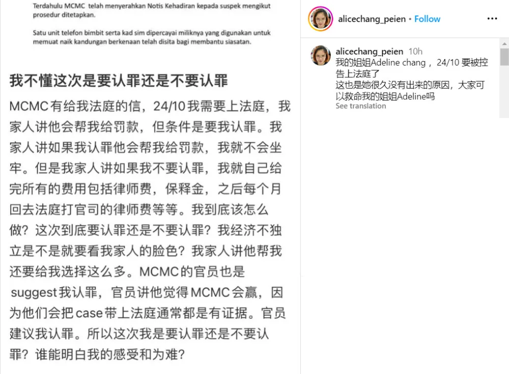 Recently, Adeline took to XiaoHongShu to ask netizens for advice regarding a legal case. In her now-deleted post, the social media figure revealed she has a court hearing on 24th October for a case involving the Malaysian Communications & Multimedia Commission (MCMC). It’s assumed that the case mentioned was her posting an obscene comment with a photo of a minor. News outlets reported that MCMC is investigating her under Section 233 of the Communications and Multimedia Act 1998.