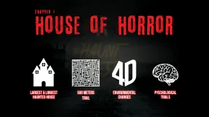 Chapter 1 – House of Horror, is the longest and largest haunted house featuring 500 meters trail filled with 50 horror characters from your worst nightmares.