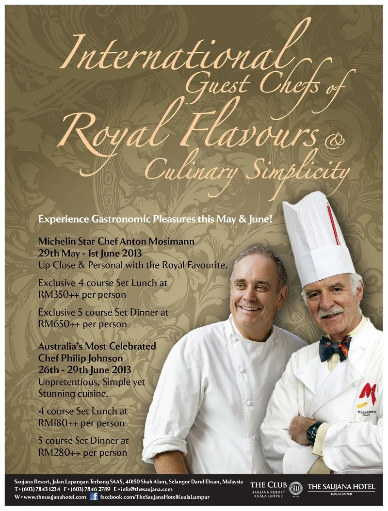 Chef extraordinaire, Anton Mosimann, returns to Malaysia as “Guest Chef” at The Club Saujana Resort from 29 May to 1 June 2013. Philip Johnson, one of Australia’s most celebrated chefs will be satisfying appetites from 26th to 28th June at The Club Saujana Resort and 28th – 29th June at The Saujana Hotel Kuala Lumpur. Guests will now have the privilege to indulge in the sensual temptations of fine culinary arts!
