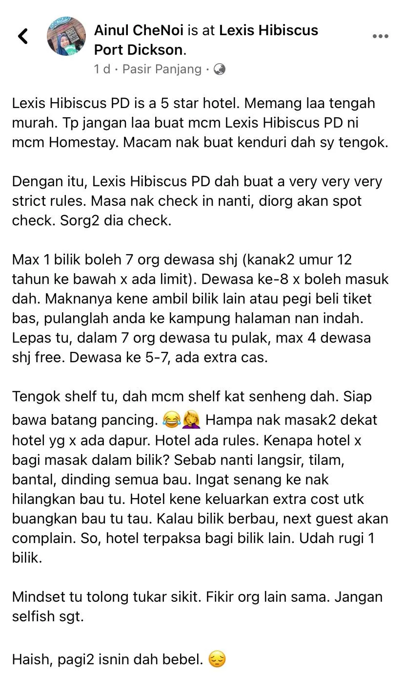 Ainul then assured everyone that the hotel is now enforcing “very strict rules” after this. The netizen shared, “The staff will carry out a spot-check, one by one, when checking in. Additionally, one room is only allowed to accommodate seven adults (this excludes children aged 12 and below).”