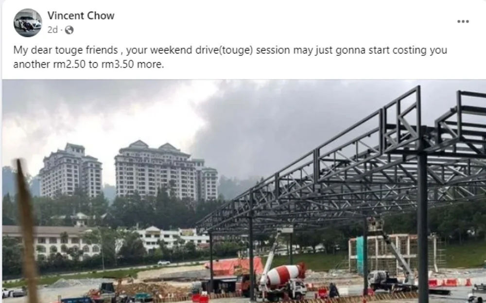 Facebook user Vincent Chow recently posted two photos in the Facebook group, ‘Eat Sleep Touge (Chat & Chill)’. His photos show what looks to be a toll gantry being constructed near Genting Highlands. According to a news outlet, the photos were taken near the big Gohtong Jaya roundabout, going through towards Batang Kali.