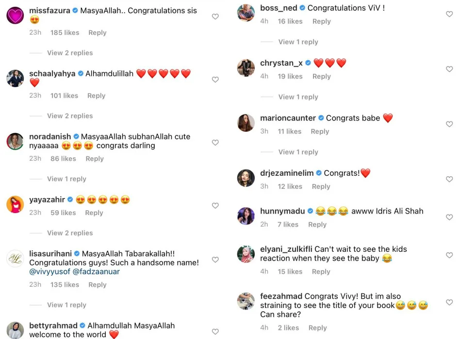 Meanwhile, the FashionValet co-founder also shared some photos of her with her newborn baby on her Instagram. The comments section has since been flooded with Vivy’s followers and also netizens leaving their congratulatory remarks to her. A few of her celebrity friends including Fazura, Nora Danish, Scha Al-yahya and Chryseis Tan were also spotted leaving their warm wishes as well!