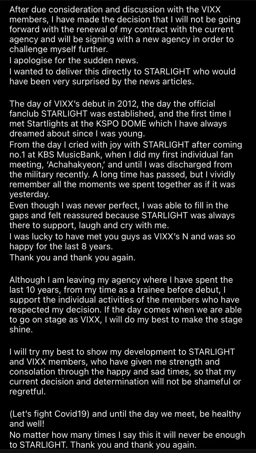 VIXX member N (real name Cha Hak Yeon, 차학연) has officially parted ways with the group’s entertainment company, Jellyfish Entertainment, after 8 years!