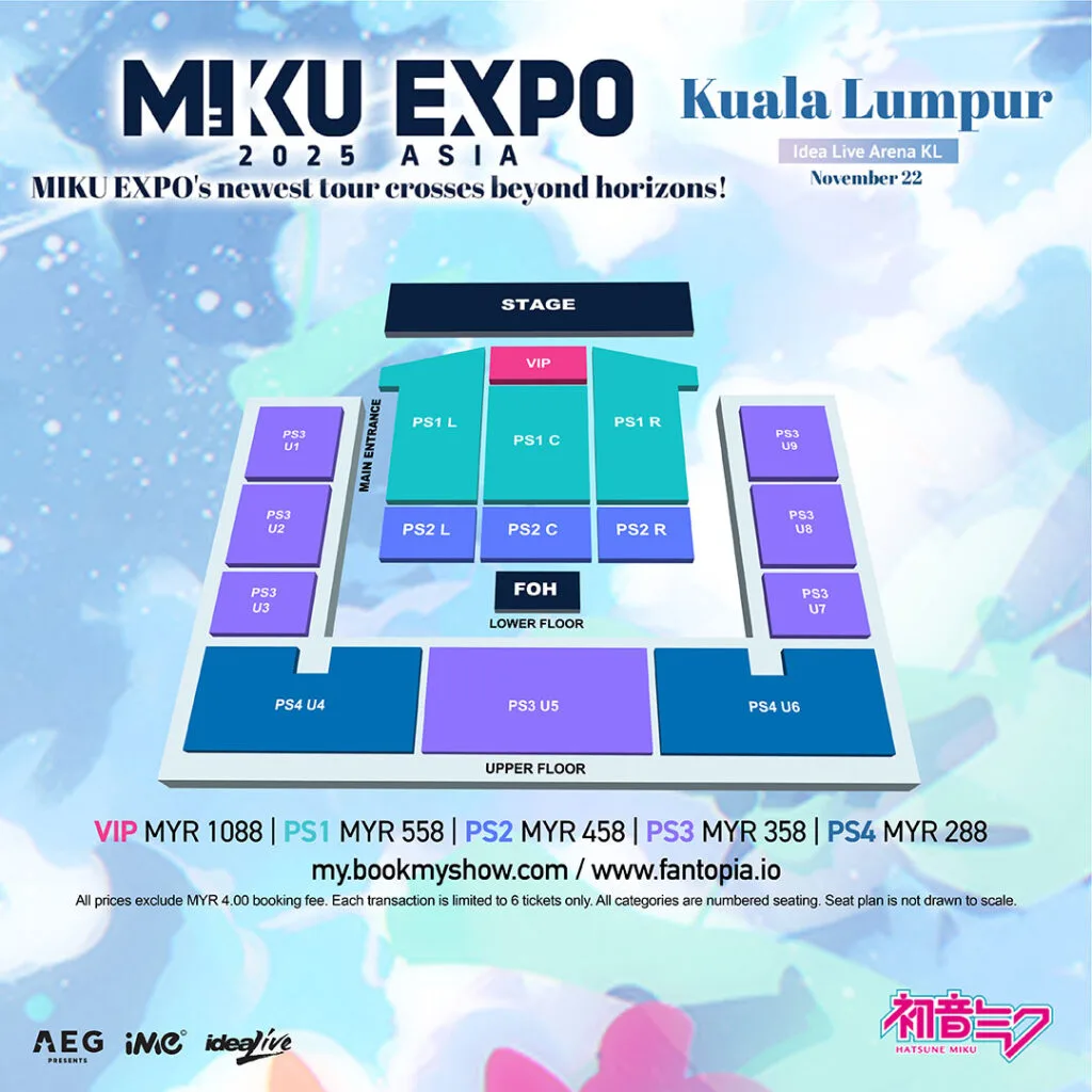Great news for Miku fans in Malaysia! iMe Malaysia has announced the official details for “MIKU EXPO 2025” in Malaysia! Ticket prices and seating plans have been unveiled, with prices ranging from RM288 to RM1088. General sale for the event begins 22nd July 2025 (Tuesday) via BookMyShow and Fantopia. Check out the seating plan below: