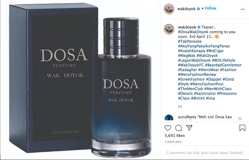 Wak Doyok shared a teaser image for his upcoming fragrance, known as Dosa (Malay word for sin) on his Instagram. It’s understood that the latest product is set to hit the market starting 3rd April (Saturday).