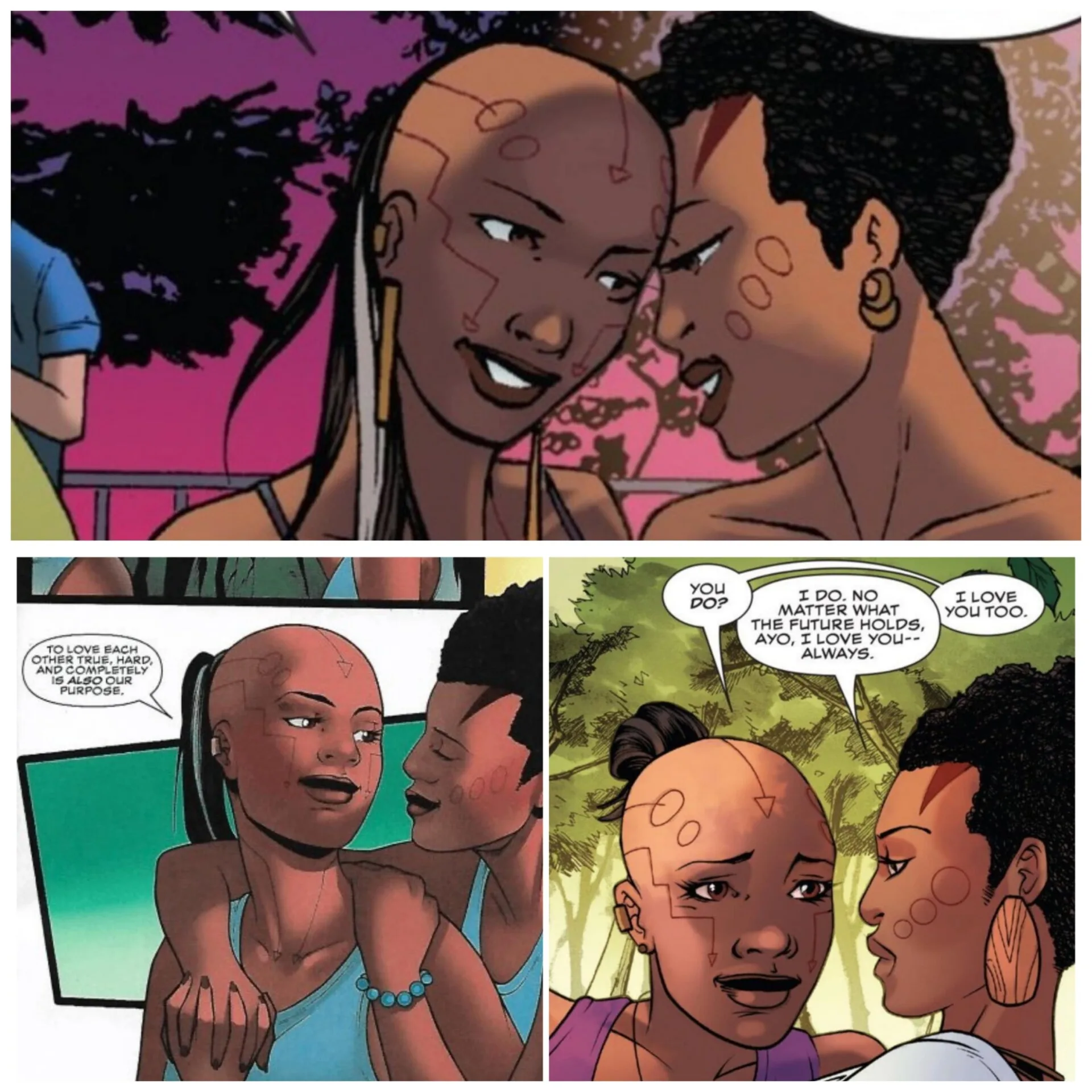 Aneka is in fact, romantically involved with another member of the Dora Milaje, Ayo. Although it is forbidden for the Dora to have romantic affiliations, the two remain in love with each other and are even tasked with protecting the royal family prior to their defection.