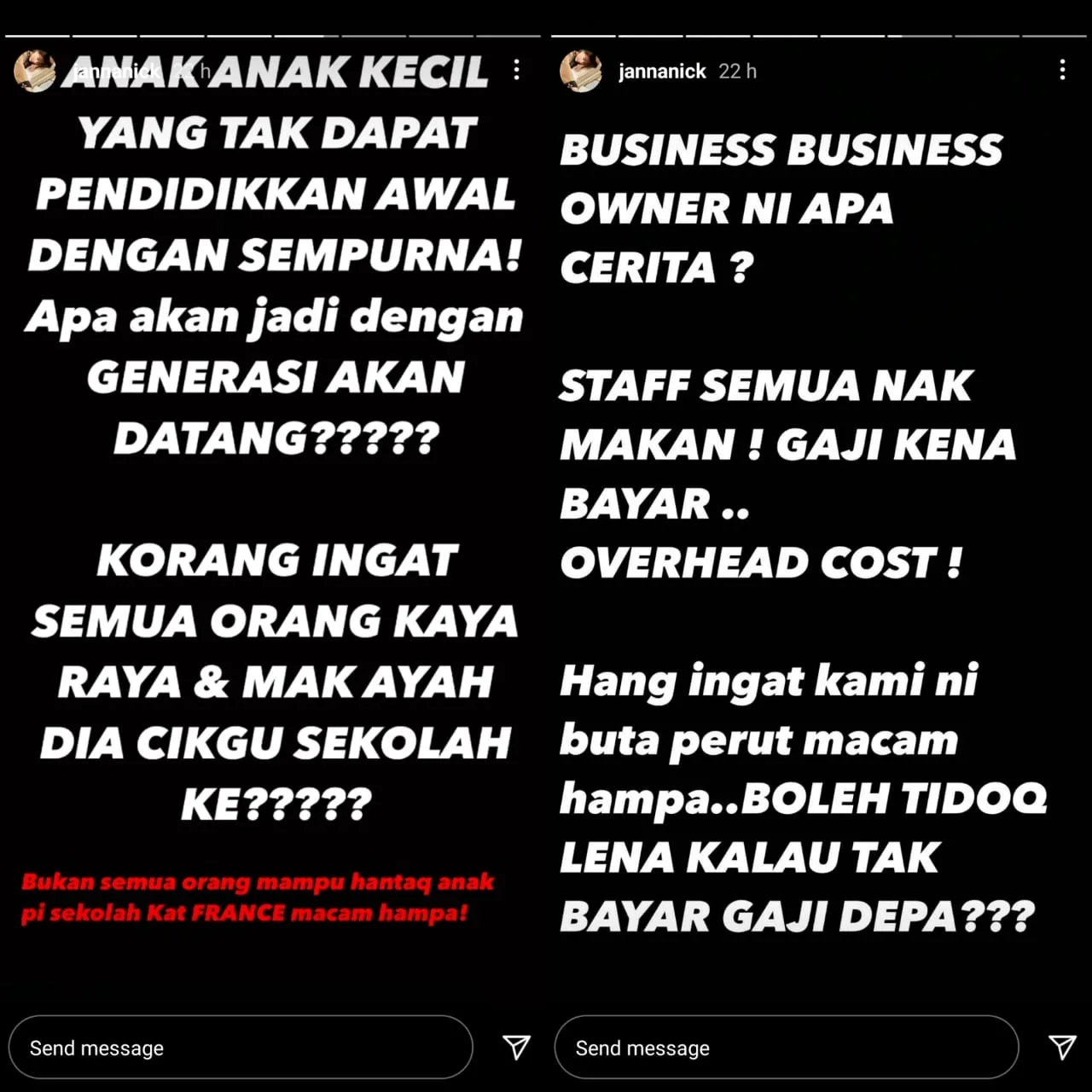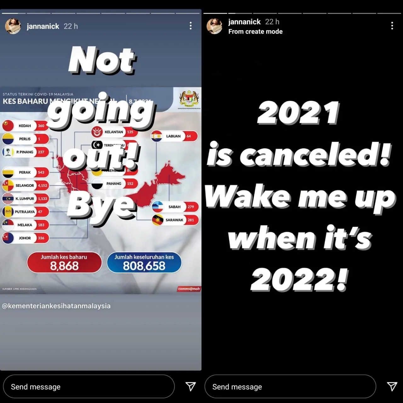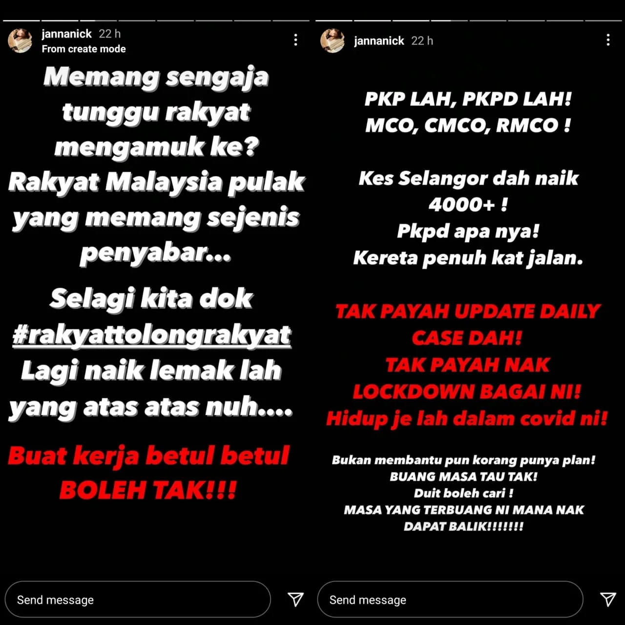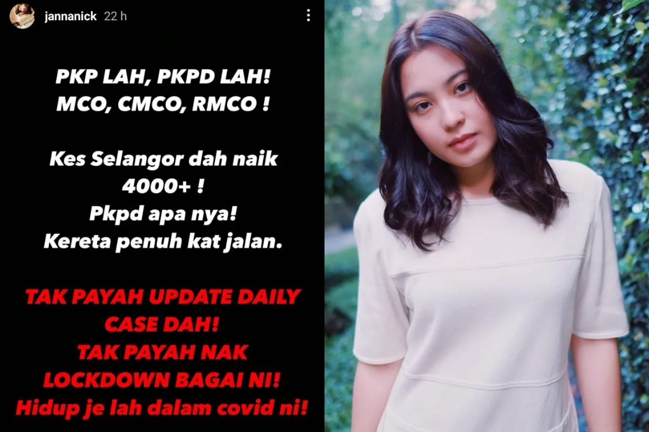 Actress and TV host Janna Nick has taken to her social media to express her outrage following the rise of new positive Covid-19 cases on Thursday, 8th July. She also expressed her frustration over the current worrying situation of the Covid-19 pandemic in Malaysia.