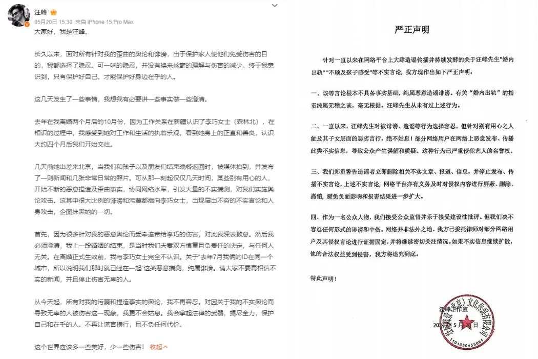 Wang Feng took to Weibo on 20th May (Monday) to formally announce his relationship with Li Qiao (李巧), also known as Sen Lin Bei (森林北). In the post, the singer revealed that he had met the public figure in October 2023, two months after finalising his divorce from Zhang Ziyi. The two had met for work purposes in Xinjiang, where the influencer was based, and slowly became acquainted. Wang Feng said that the two had officially started dating four months later, around February.