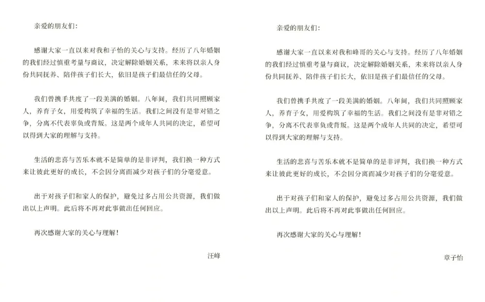 “We’ve had a wonderful marriage together. In the past eight years, we have taken care of our family, raised our children, and built a happy life (filled) with love,” they reassured. “There is no debate about right and wrong between us, and (the) separation does not mean betrayal. This is a decision made by two adults together, and (we) hope we can get your understanding and support.”