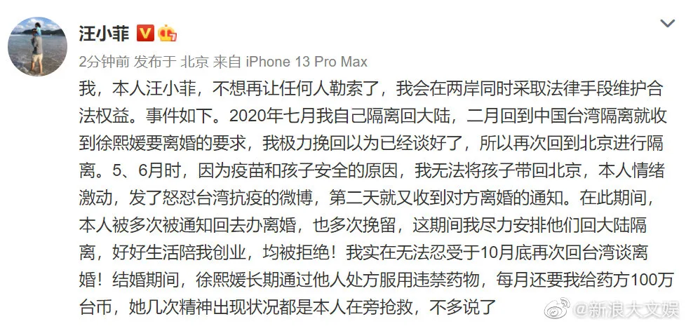 Xiaofei had plans to bring his children to Beijing in May and June. However, due to the complications of vaccines and child safety, it didn’t pan out. This frustrated Xiaofei and he made the infamous post criticising Taiwan’s epidemic procedures. This apparently cemented Barbie’s desire to divorce Xiaofei. “During this time, I had been notified to return to (discuss) the divorce, and I (convinced Barbie otherwise) many times,” Xiaofei stated. “During this time, I tried my best to make arrangements to bring them to the mainland to live a good life and accompany me to start a business, but they were all rejected!”