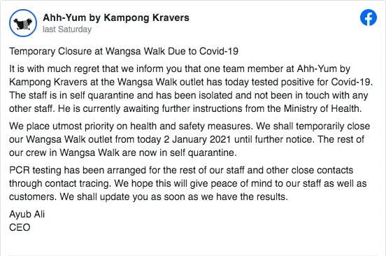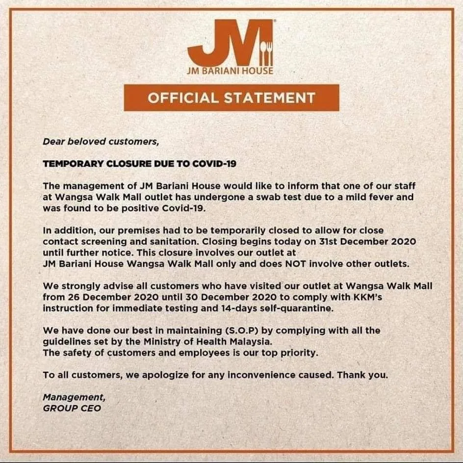 According to the management, JM Beriani had been closed since last Thursday (31st December 2020) after a staff working there experienced mild fever and went for a swab test. Similarly, a team member from Ahh-Yum (located near Rotiboy and Boost) had contracted the deadly virus last week. As such, the rest of the crew are now in quarantine.