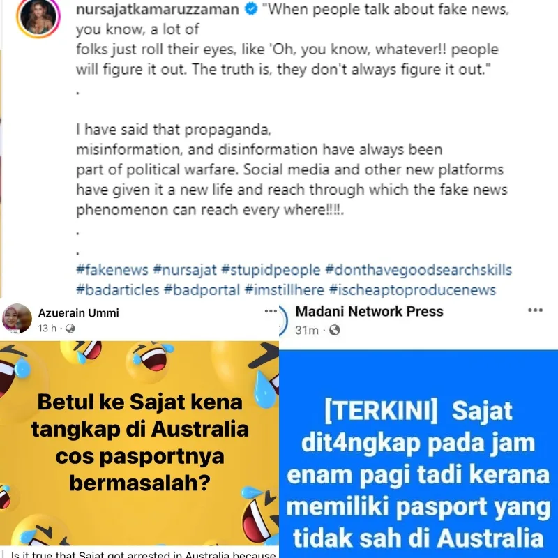 Earlier today (Friday, 18th August), Nur Sajat uploaded a carousel post on Instagram showing screenshots of two separate Facebook posts. The first post was a netizen mockingly asking, “Is it true that Sajat got arrested in Australia cause of passport trouble?”. The second slide showed a fake news outlet page with a headline that reads, “[BREAKING] Sajat arrested at 6am in Australia over invalid passport”.