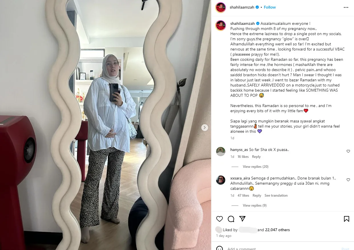While we’re on the topic of motherhood, Shila is currently 8 months pregnant with her second child and recently revealed that she had a moment of panic, believing that she was in early labour. In an Instagram post shared over the weekend, the soon-to-be-mother of two said that she and Ubai were at a Ramadan bazaar when she started experiencing pain. Thinking that the baby was coming, the couple rushed home but thankfully, it was just a false alarm.