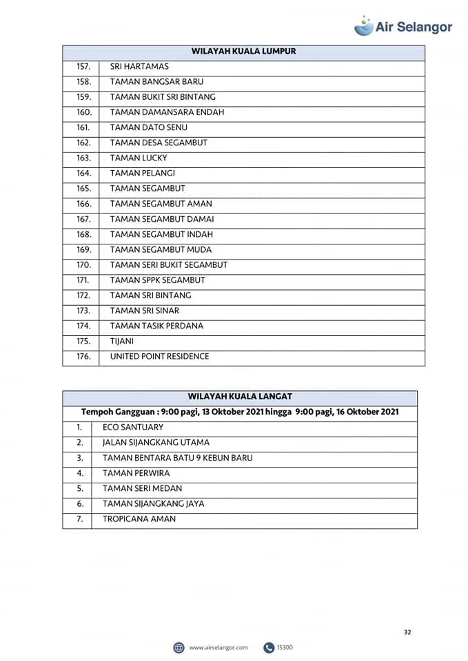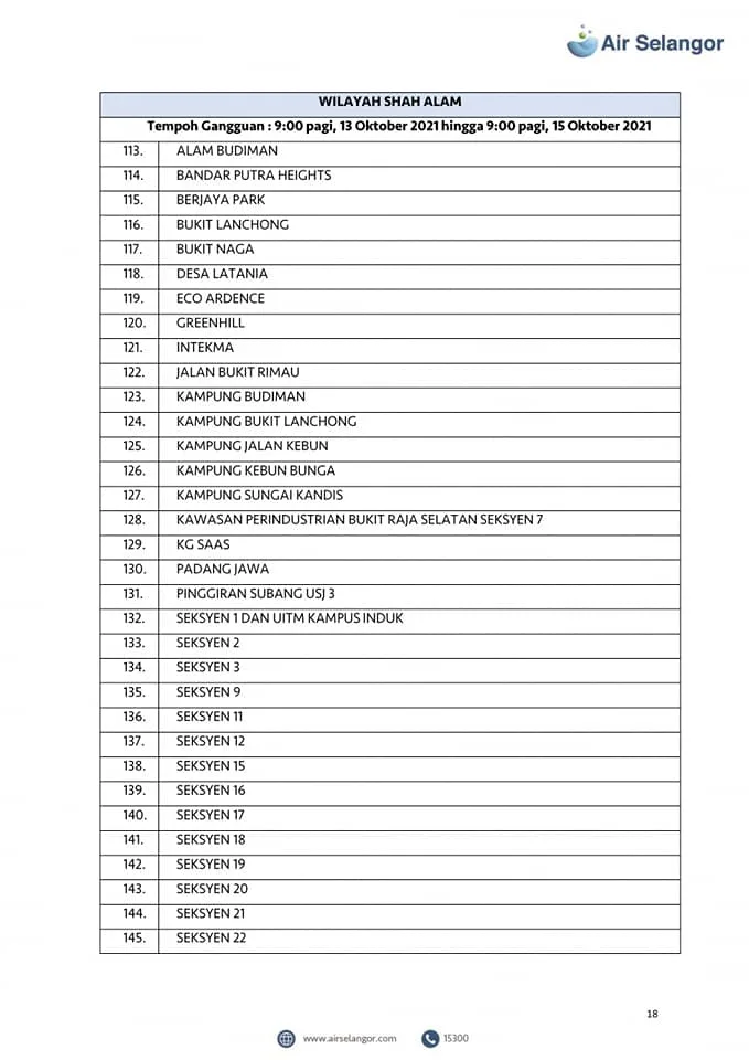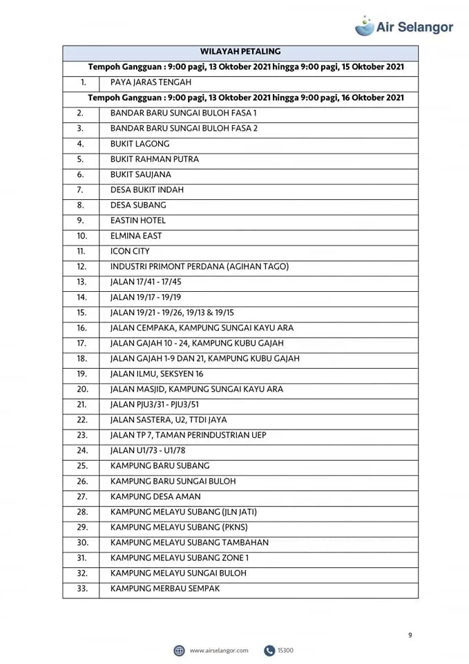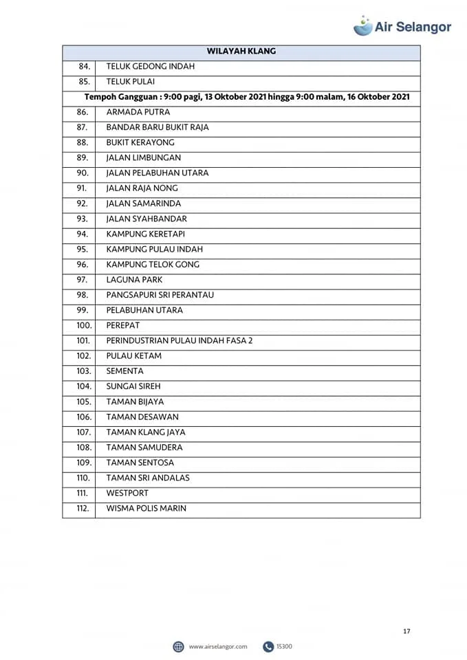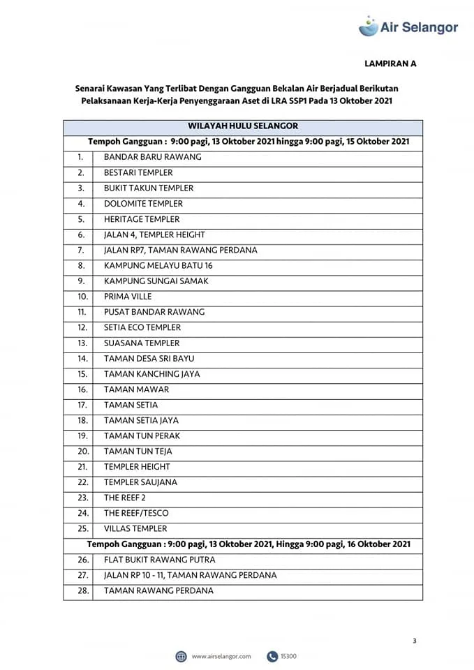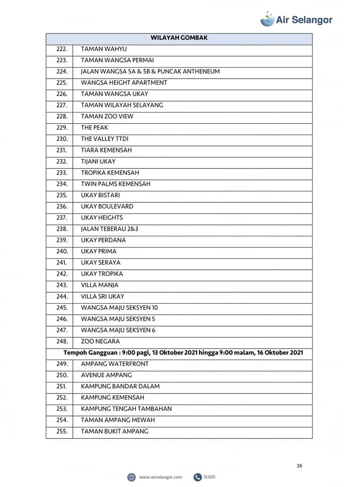 From 13th – 16th October, 998 areas across the Petaling, Klang, Shah Alam, Gombak, Kuala Lumpur, Hulu Selangor and Kuala Selangor regions will experience water disruption due to upgrading and maintenance work at the Sungai Selangor Phase 1 Water Treatment Plant (SSP1 WTP).