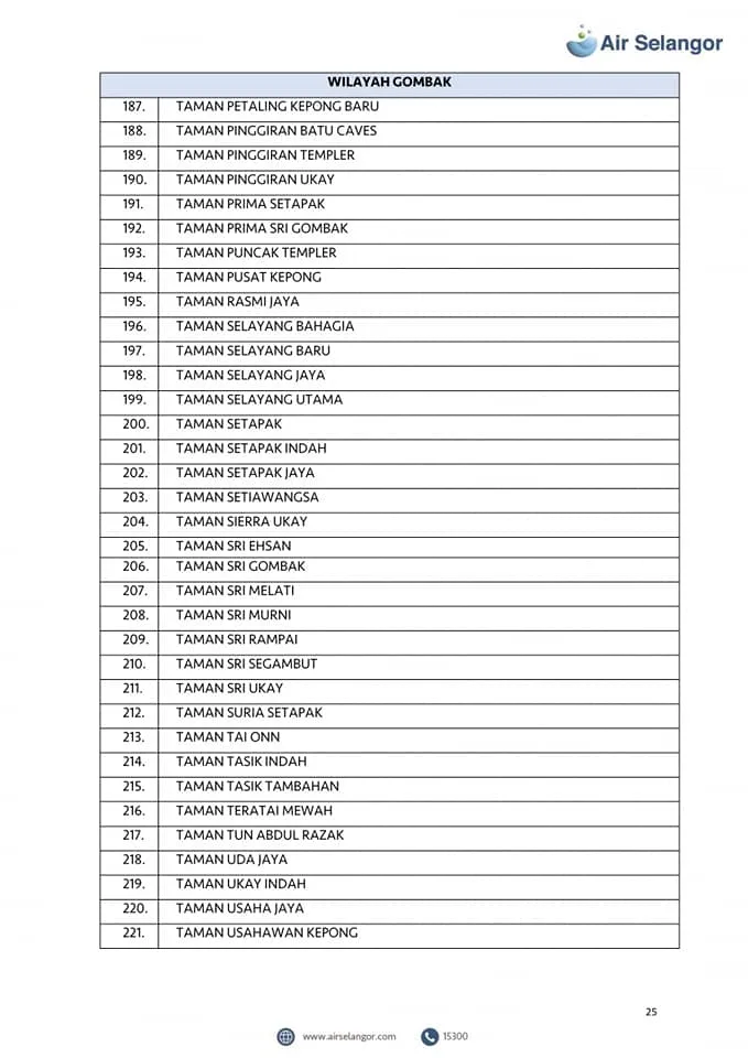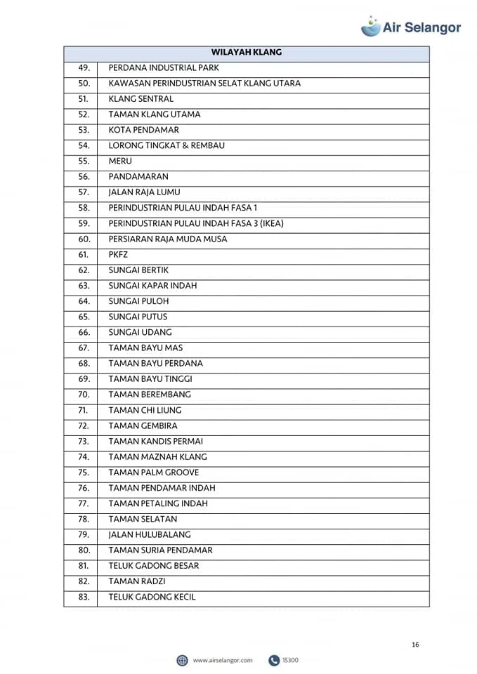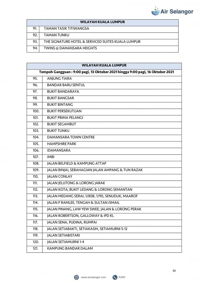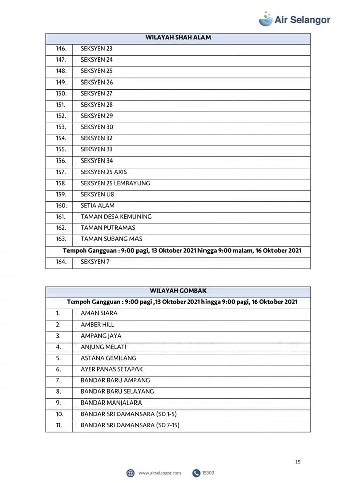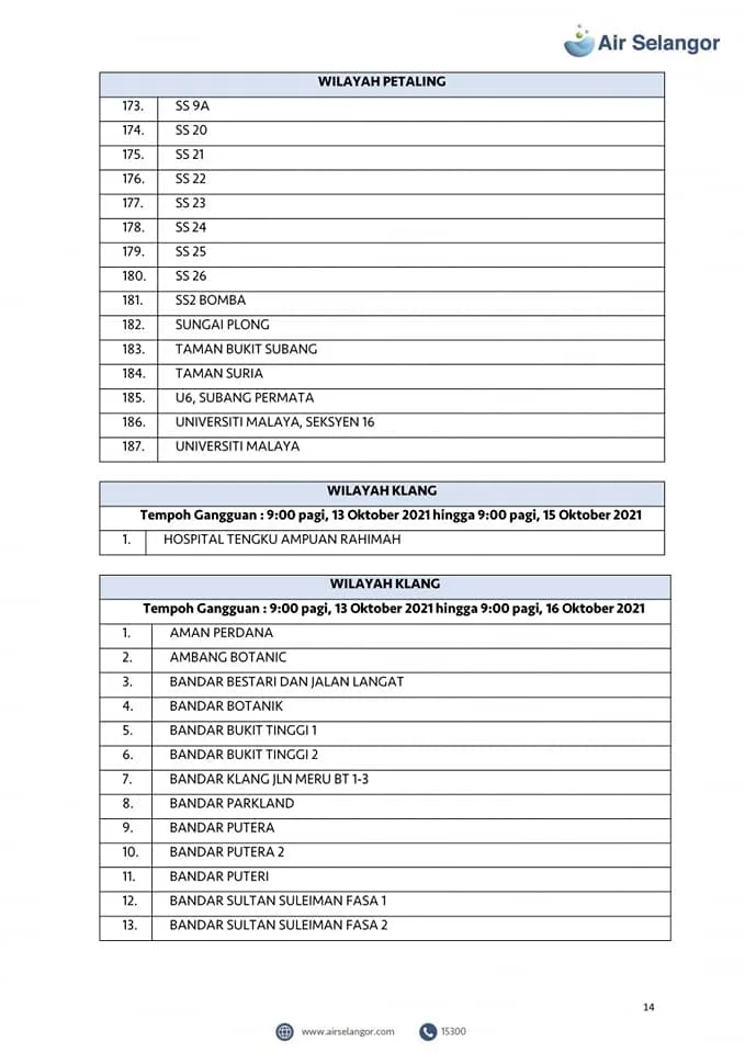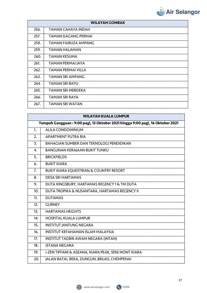 From 13th – 16th October, 998 areas across the Petaling, Klang, Shah Alam, Gombak, Kuala Lumpur, Hulu Selangor and Kuala Selangor regions will experience water disruption due to upgrading and maintenance work at the Sungai Selangor Phase 1 Water Treatment Plant (SSP1 WTP).