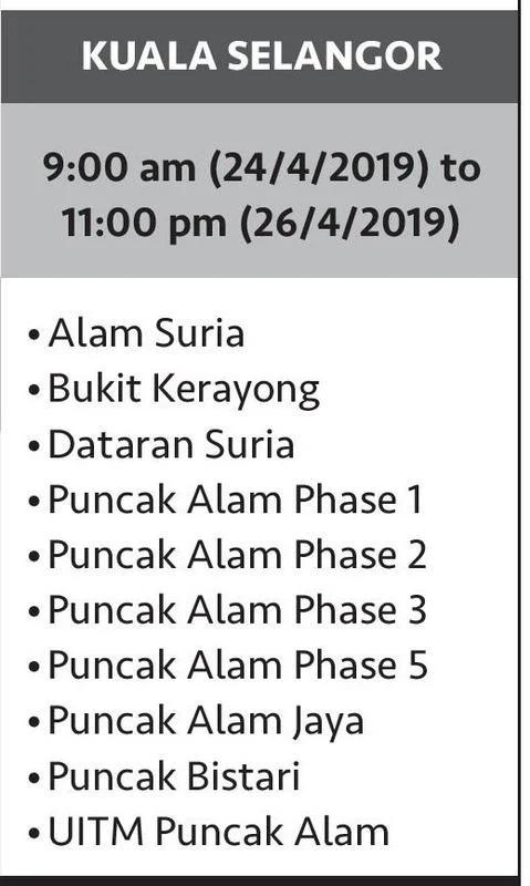Syarikat Bekalan Air Selangor (Syabas) announced yesterday that the major water cut will take place on 24th April (Wednesday) onwards and will affect 4 million consumers. This is due to the shut down of the Selangor River Phase 2 Water Treatment Plant for upgrading works.
