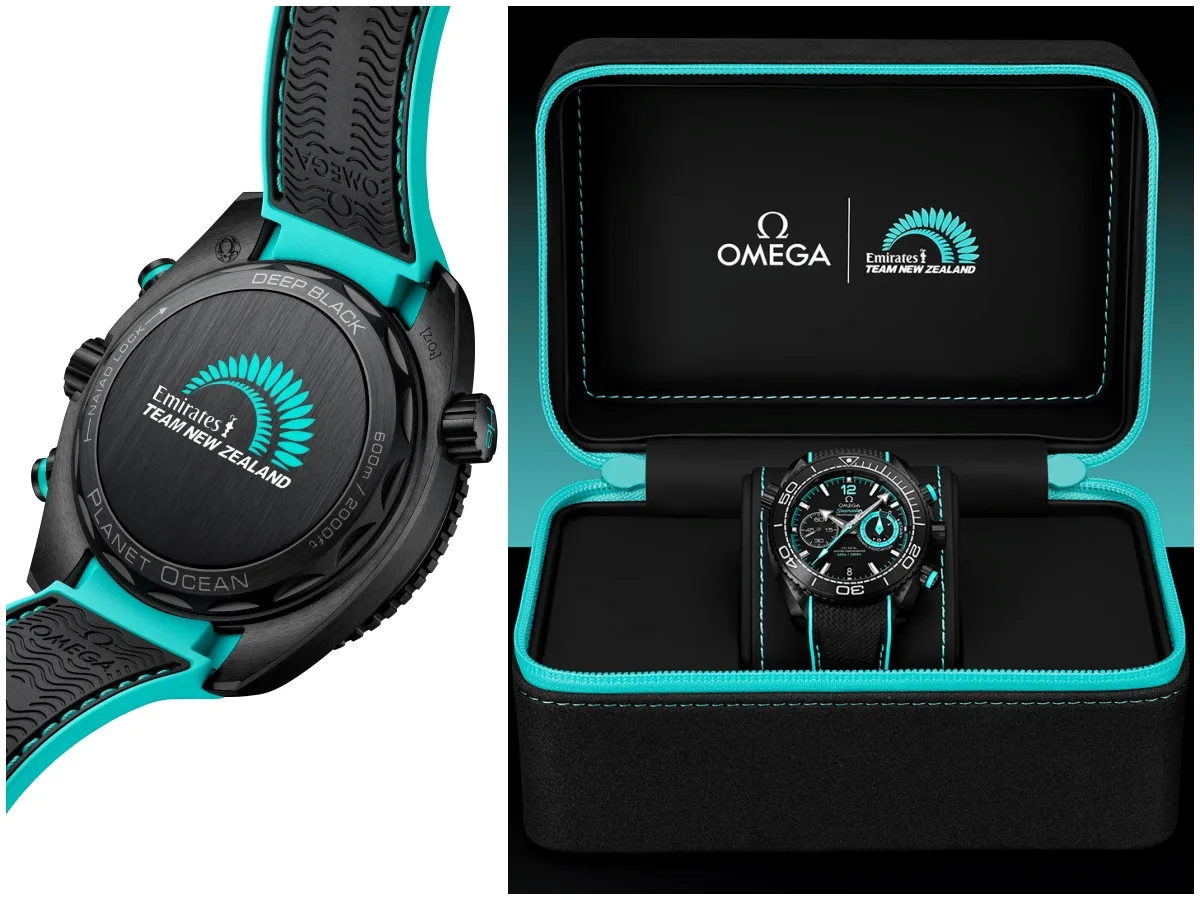 As a salute to the kiwi crew, the NAIAD LOCK caseback has an Emirates Team New Zealand logo with turquoise fern and white lettering. Providing the power inside the watch is OMEGA’s Master Chronometer Calibre 9900. OMEGA presents the watch on a black and turquoise structured rubber strap with turquoise stitching and black ceramic clasp and offers three ways to switch out the look: an additional rubber strap and two NATO straps, all in complementary colours.