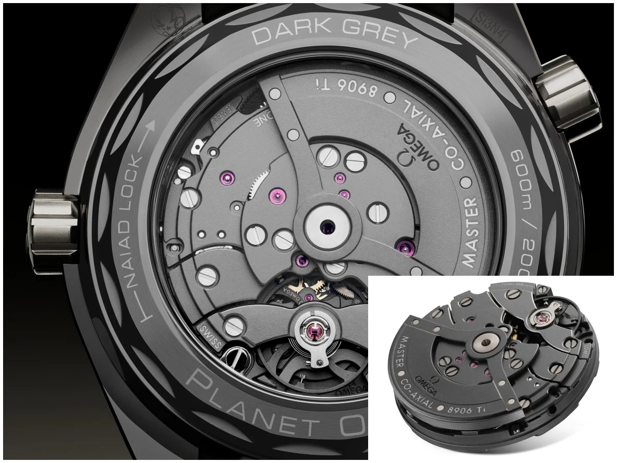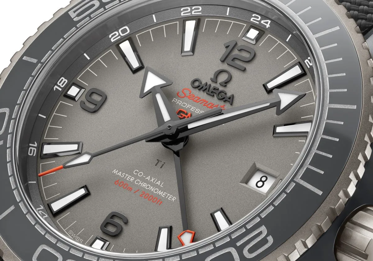 In design, this dark grey material has been used for the 45.5 mm casebody, patented NAIAD LOCK caseback, and bezel ring. Elsewhere OMEGA has used contrasting Grade 5 titanium for the bezel body and strap folding clasp, as well as the sand-blasted dial with its anthracite hands and indexes. This particular standard of titanium is favoured by the aerospace industry. While accentuating the watch’s durable integrity, it does so without adding too much weight.