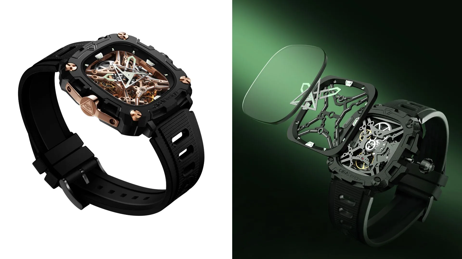 You can easily observe the inner workings of the device as well, thanks to its back-to-front transparent skeleton design. The genius design choice allows you to see into the watch and through it as well, providing a view of both the signature X-shaped skeleton and the Eye of Horus triangle that doubles as a second watch hand.
